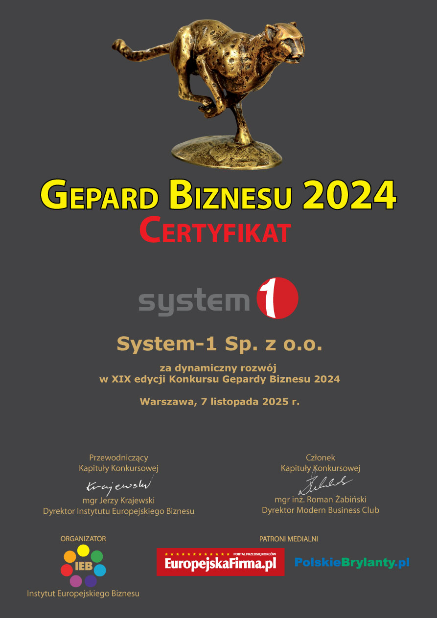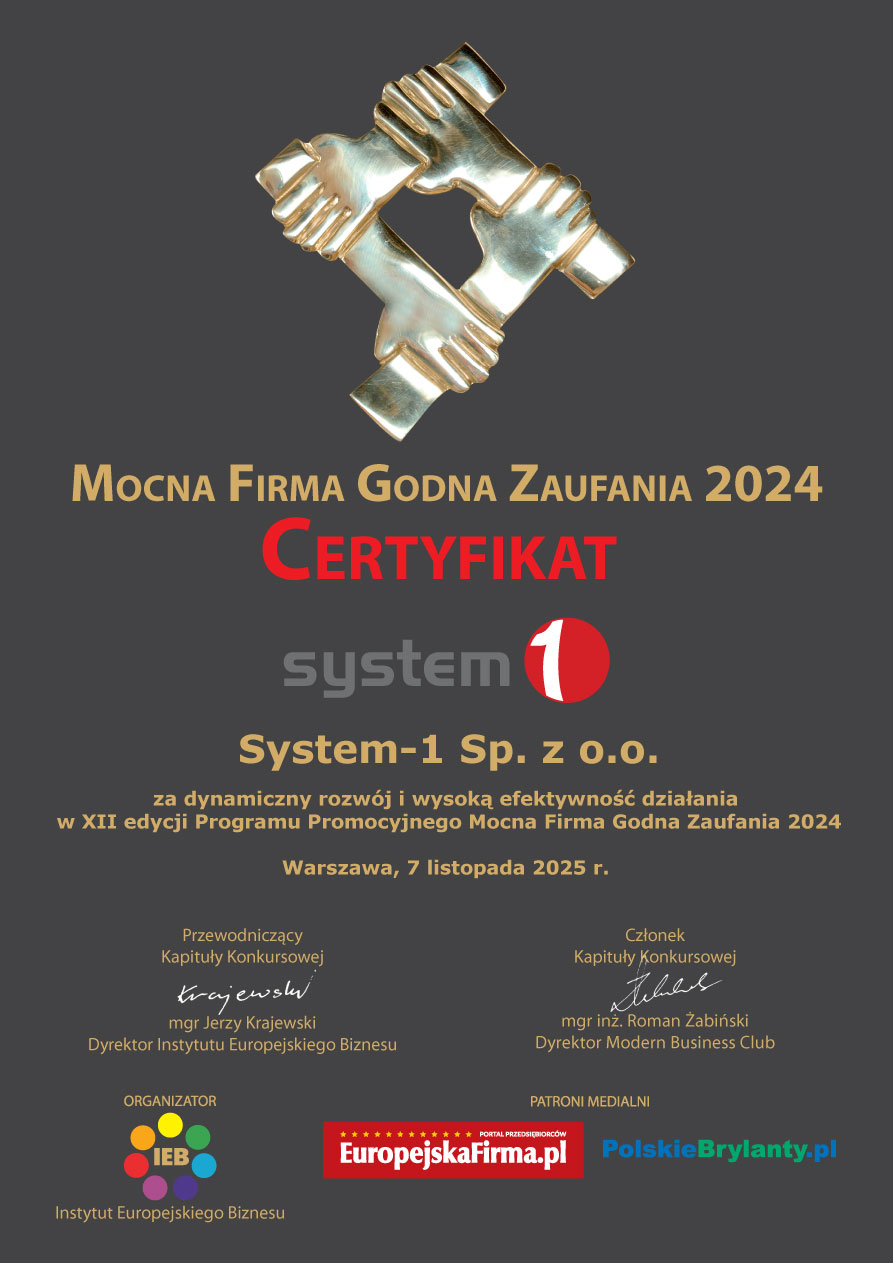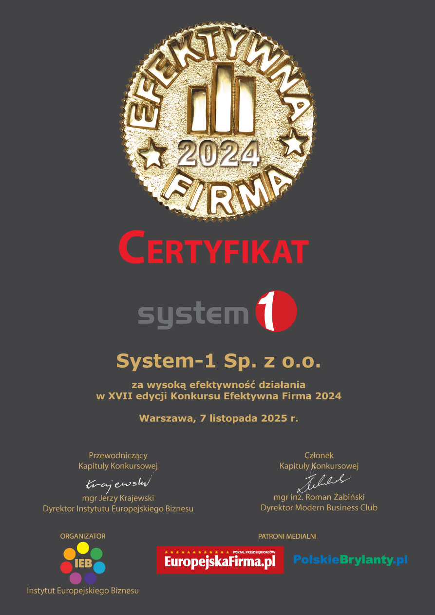System-1 Spółka z o.o. to obecnie ponad 30 osób – konsultantów i specjalistów. Siedziba firmy znajduje się w Poznaniu, oddział w Katowicach i sieć partnerów w całej Polsce. Długoletnia obecność na dynamicznie rozwijającym się polskim rynku pozwoliła zgromadzić duży zakres wiedzy i doświadczenia. Szczególny rozwój nastąpił w obszarze planowania i rozliczania przewozów, prowadząc do wyspecjalizowania się w tworzeniu oprogramowania dla firm transportowych.